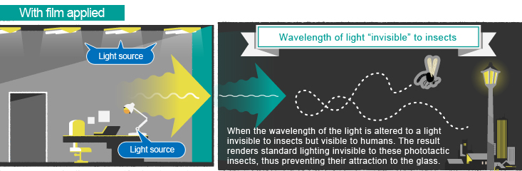 The insect repellent versions of "WINCOS Architectural Films" help to prevent insects becoming attracted to emitted light from workplace glazing, thereby significantly contributing to a reduction of insect numbers around the building perimeter